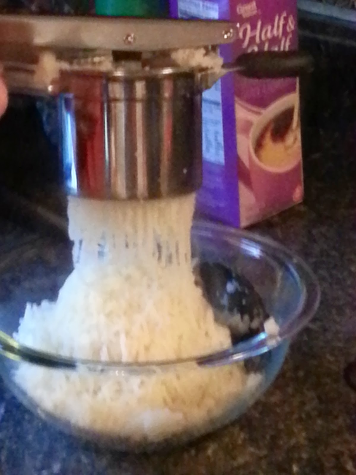 He has about 15 minutes to go and he has drained the potatoes and is ready to mash them with our lovely ricer, which we got as a wedding gift just a few months ago.